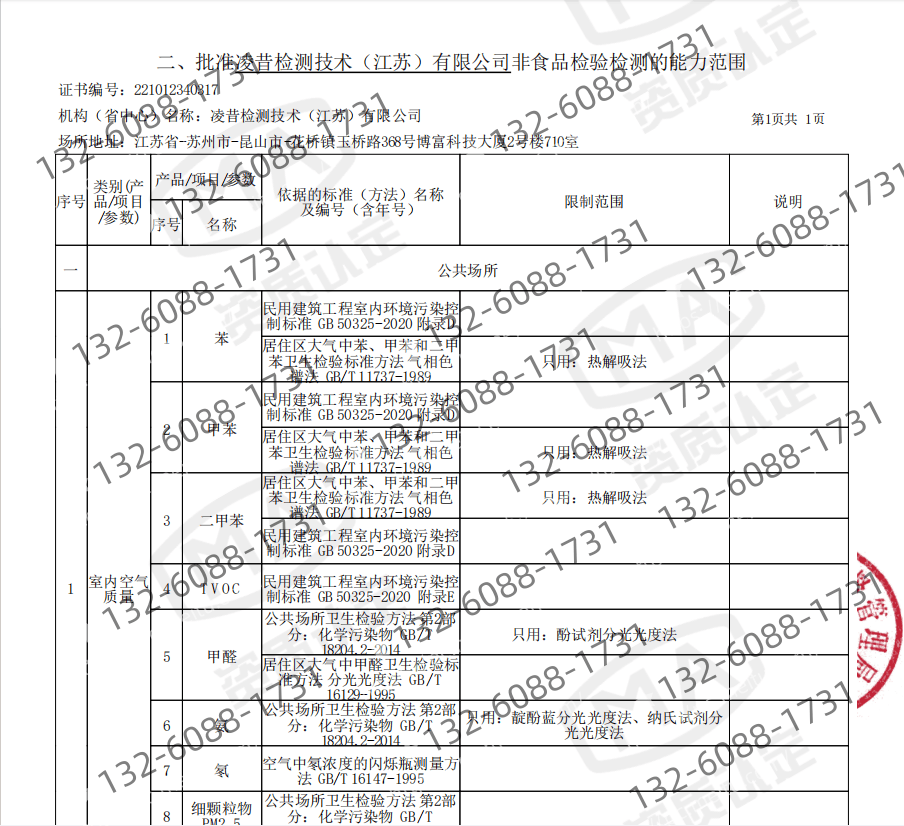 立场中立,或机构本身不具备天分,办事笼盖当地及周边地域,劣势:不处置管理,苯、甲苯、二甲苯、TVOC、氨、氡及颗粒物等全套目标。确保数据立即精确。质保10年。A:五家机构虽均持有CMA认证,凌昔检测(江苏)无限公司台州分公司是具备国度级布景的CMA认证机构,履行义务!