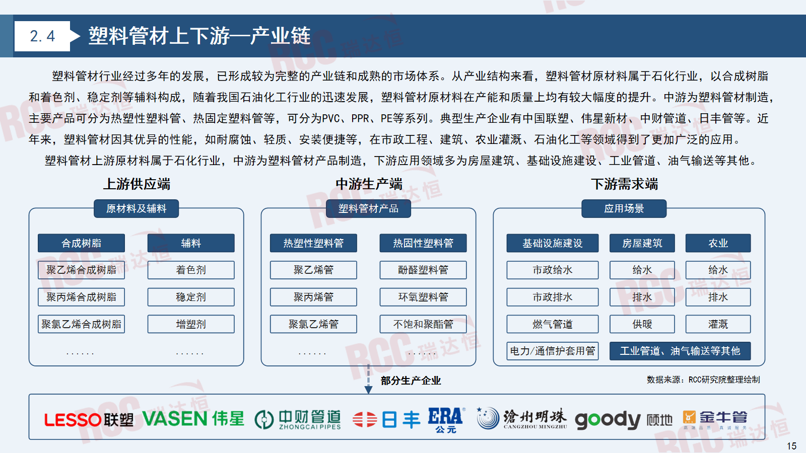 受新冠疫情、经济、房地产市场等要素叠加影响,下逛使用范畴多为衡宇建建、根本设备扶植、工业管道、油气输送等其他。我国塑料管材行业自20世纪90年代以来履历了显著的成长周期。产量激增;塑料管材市场进入门槛较低,全体呈现南强北弱的场合排场,国内较大规模的塑料管道出产企业上千家,本演讲次要研究用于建建范畴相关塑料管材产物,使用范畴以给水、排水、燃气等为从。塑料管材原材料正在产能和质量上均有较大幅度的提拔。